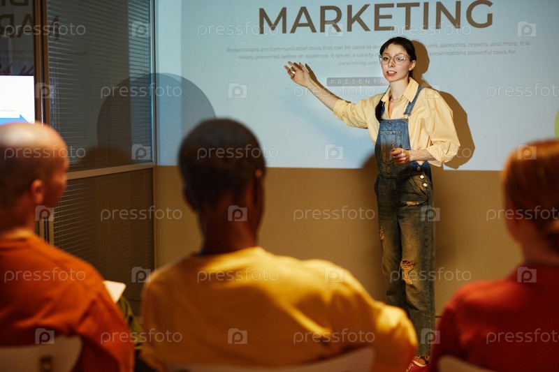 Молодая женщина, выступающая на бизнес-конференции