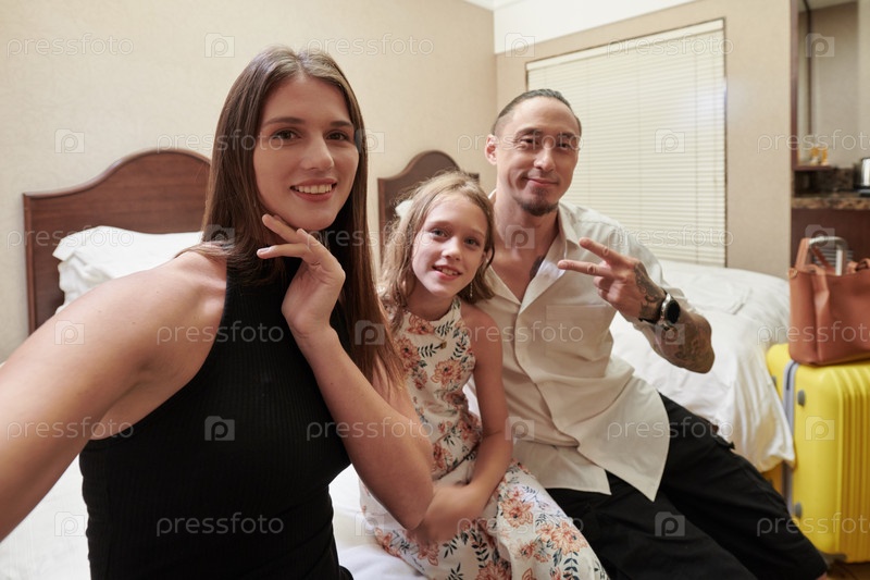 Семья делает селфи в гостиничном номере