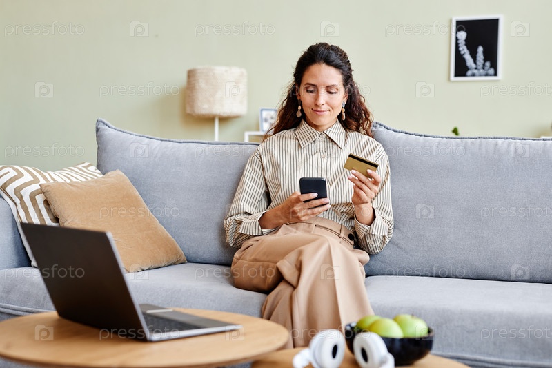 Женщина, держащая кредитную карту для покупок в Интернете дома