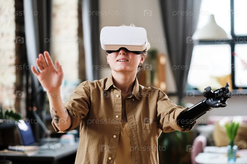 Девушка с протезом играет в игру виртуальной реальности