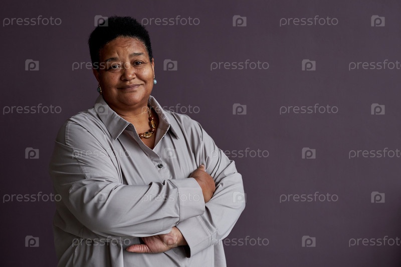 Минимальная талия вверх черная старшая женщина улыбается перед камерой