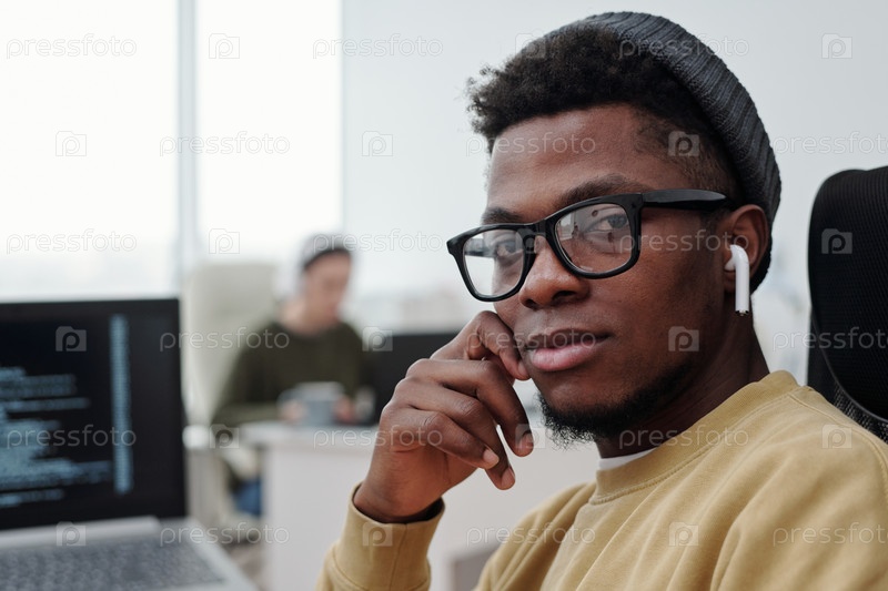 Лицо молодого серьезного афроамериканского мужчины-программиста, смотрящего на камеру
