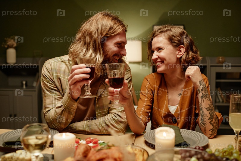 Счастливая пара сидит за обеденным столом
