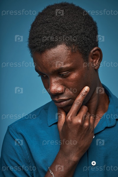 Ближайший снимок чернокожего мужчины, размышляющего на синем фоне