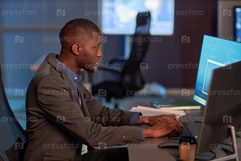 Черный ИТ-разработчик в костюме, работающий над проектом данных в офисе