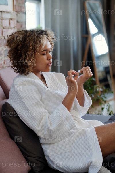 Молодая расслабленная женщина снимает ногти, сидя на кровати