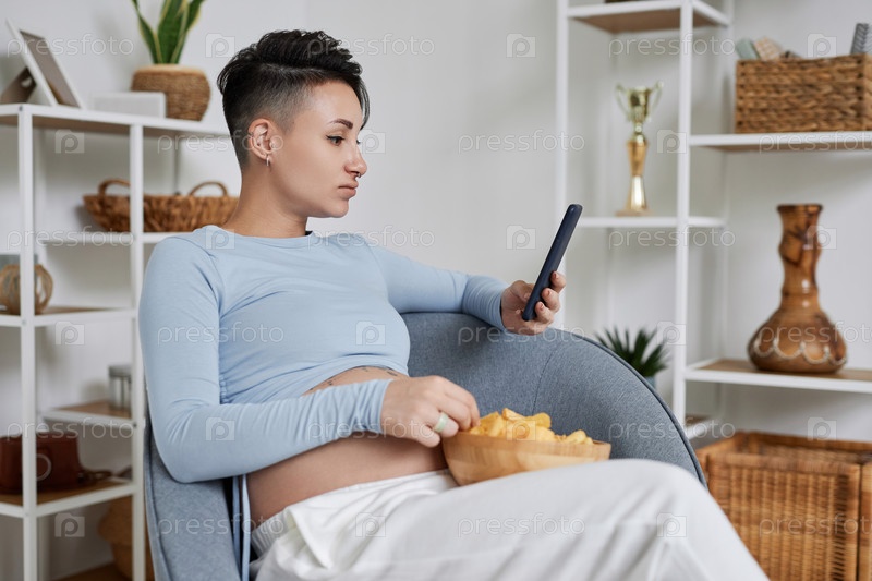 Татуированная беременная женщина, использующая смартфон дома в обстановке с декором