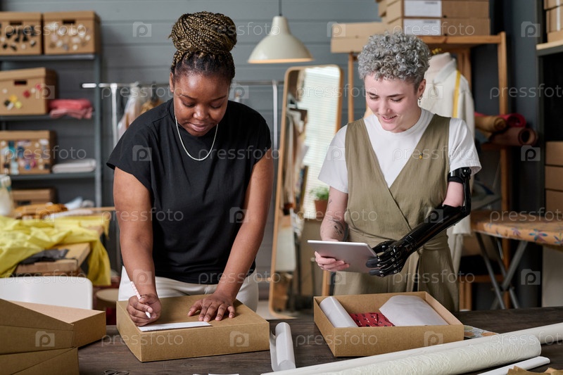 Счастливая девочка с частичной рукой использует планшет, в то время как ее коллега упаковывает посылку