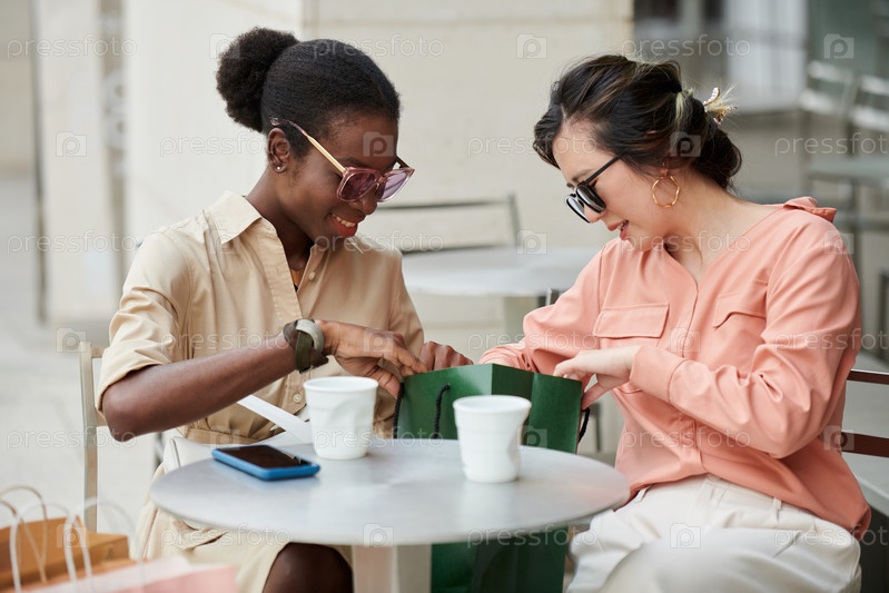 Веселые друзья обсуждают покупки