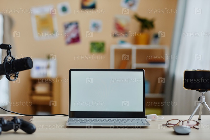 Ноутбук с пустым экраном стоит на столе среди смартфона и микрофона