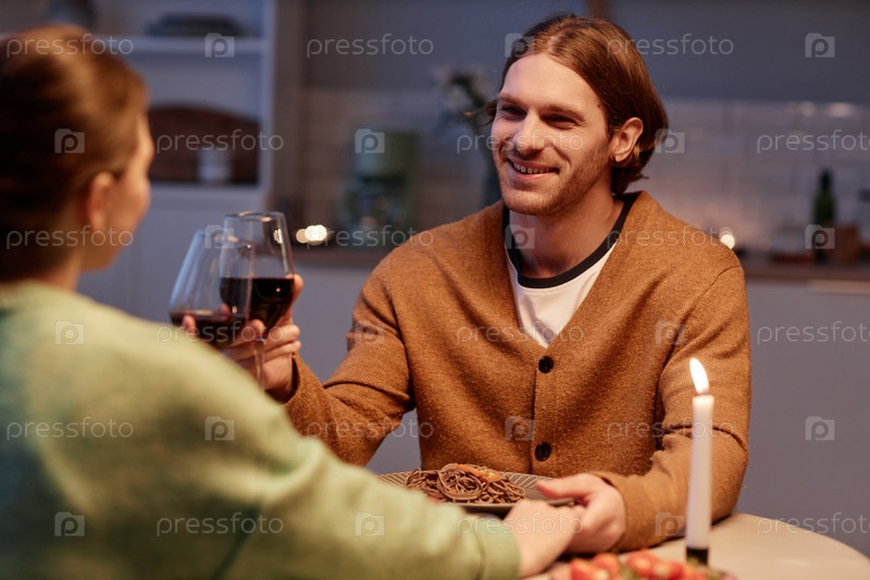 Молодой человек пьет вино с женой и наслаждается романтическим ужином дома