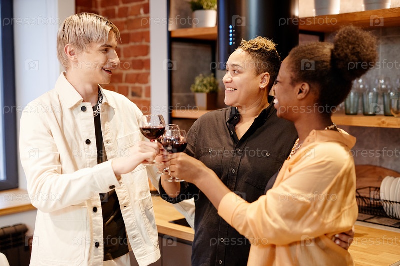 Трое счастливых молодых мультикультурных друзей со стаканами вина делают тосты