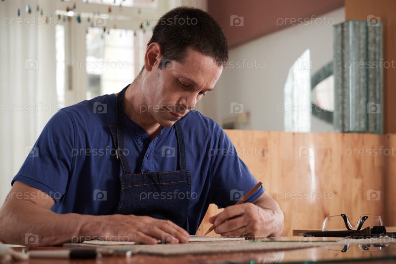 Молодой ремесленник рисует эскизы в блокноте