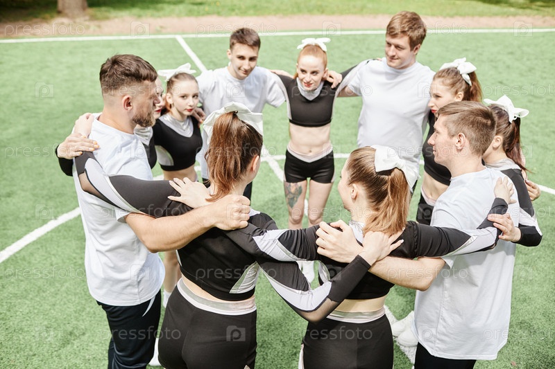 Команда чирлидеров стоит в кругу с тренером