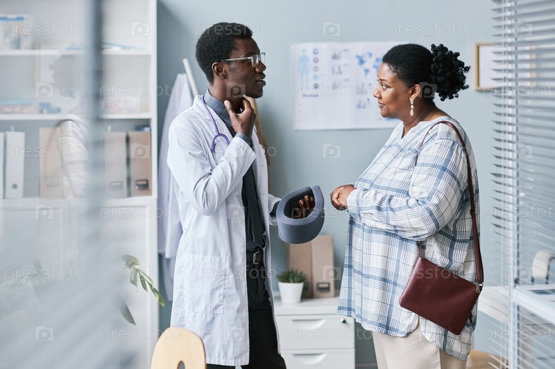 Молодой чернокожий врач, держащий брекеты на шее и разговаривающий с женщиной-пациентом в клинике