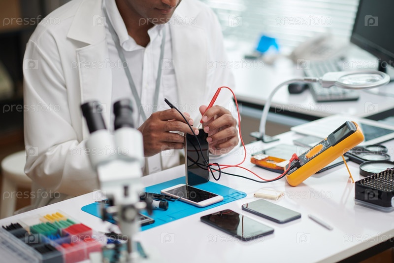 Ремонтник проверяет батарею смартфона