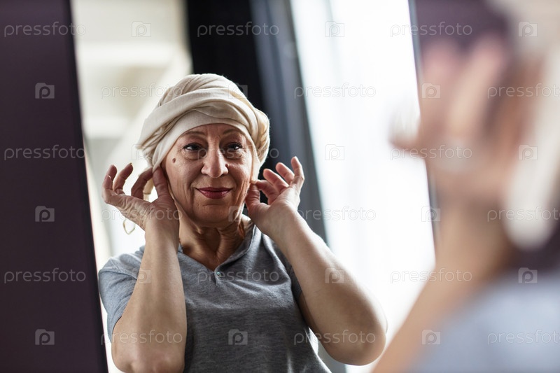 Зрелая лысая женщина связывает платок