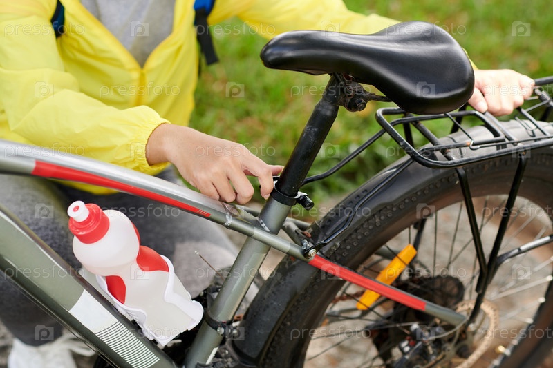 Женщина-велосипедистка, регулирующая багажный носитель