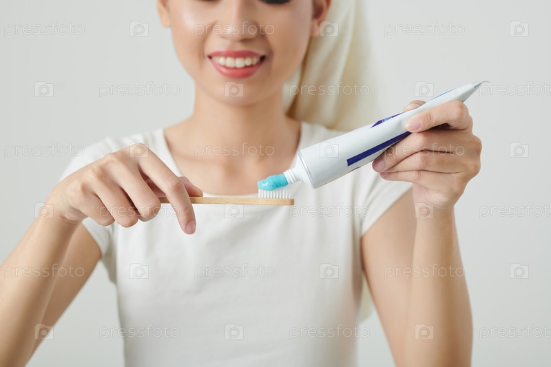 Женщина, наносящая зубную пасту на щетку