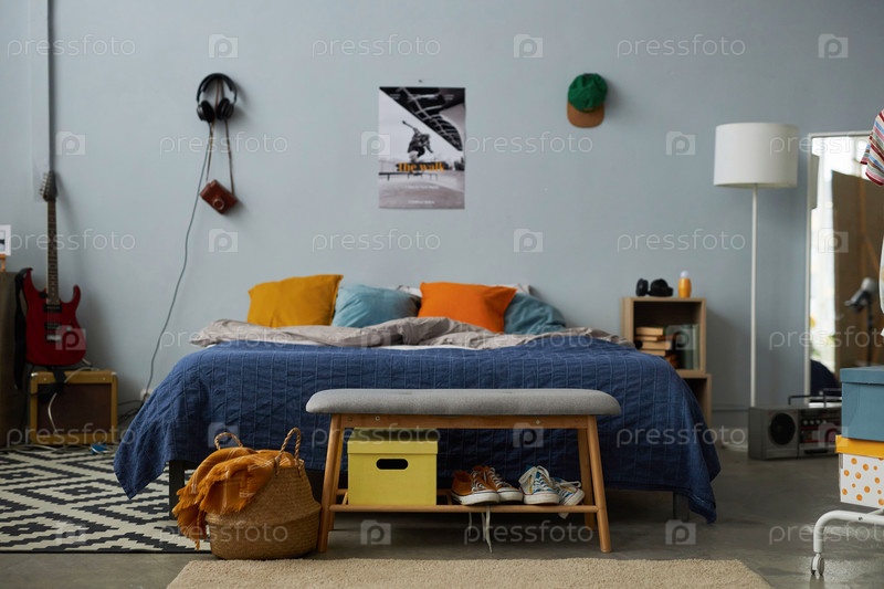 Передний вид удобной двуспальной кровати с подушками, стоящей на серой стене
