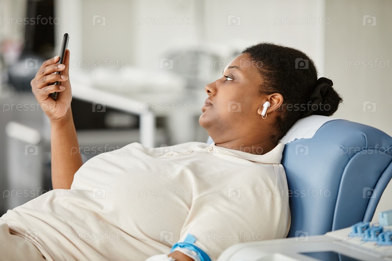 Женщина в Центре донорства крови с помощью смартфона