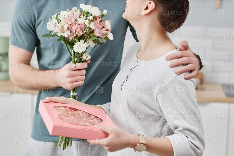 Близкий план романтического молодого человека, дающего цветы жене в День святого Валентина