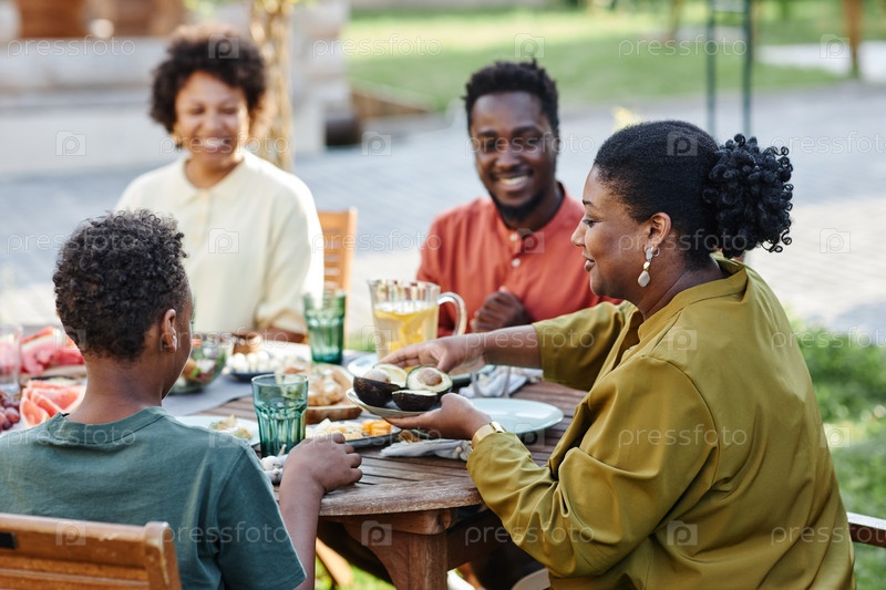 Черная семья наслаждается ужином вместе на свежем воздухе