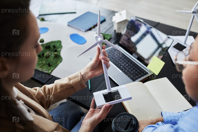 Люди изучают макет ветряной мельницы