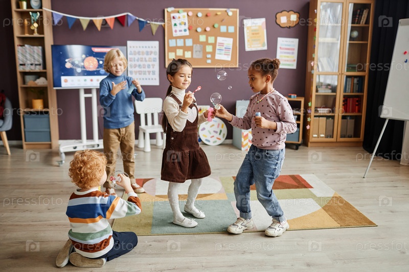 Группа беспечных детей, развлекающихся мыльными пузырями