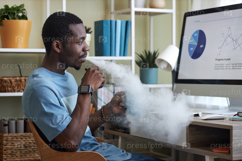 Боковой вид молодого бизнесмена, курящего электронную сигарету и анализирующего данные