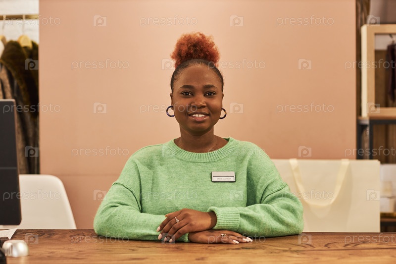 Вид спереди улыбающаяся чернокожая женщина смотрит на камеру у прилавка в магазине одежды