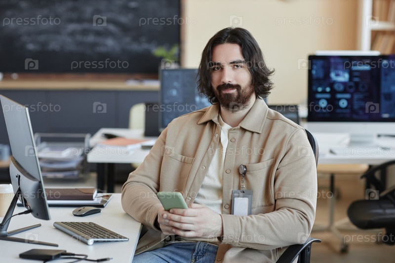 Молодой бородатый ИТ-инженер со смартфоном, смотрящий на камеру