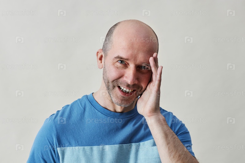 Минимальный улыбающийся лысый мужчина смотрит на камеру в студии