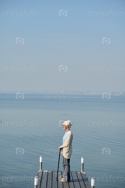 Длинный снимок женщины-пенсионера с тростью, стоящей у озера
