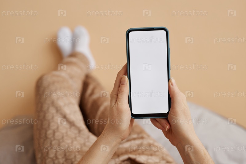 Женские руки, держащие смартфон с макетом белого экрана дома