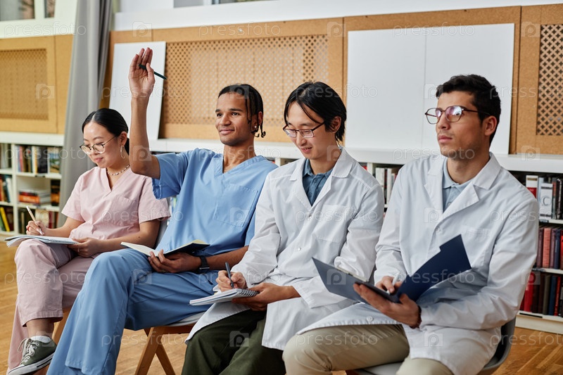 Разнообразная группа медиков в ряд, сидящих в аудитории на лекции или семинаре