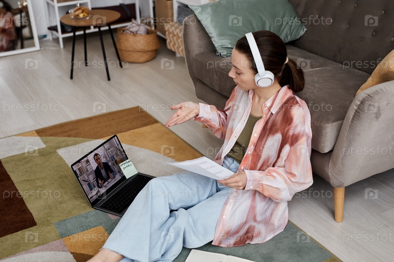 Молодая уверенная женщина в наушниках, общающаяся с репетитором