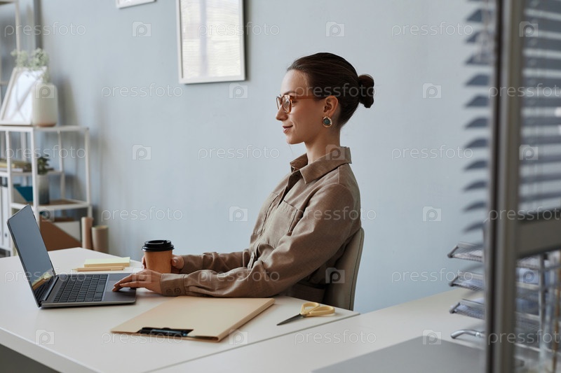 Элегантная молодая женщина в очках, использующая ноутбук на рабочем месте в офисе