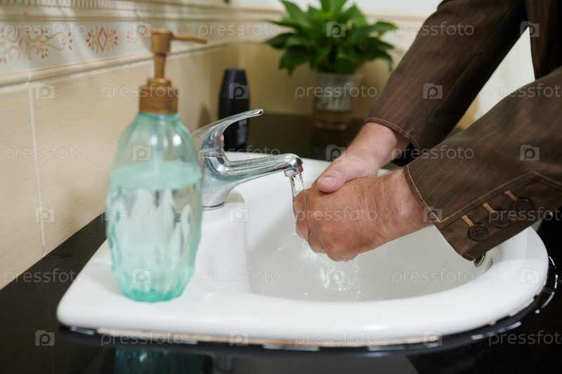 Старший мужчина моет руки