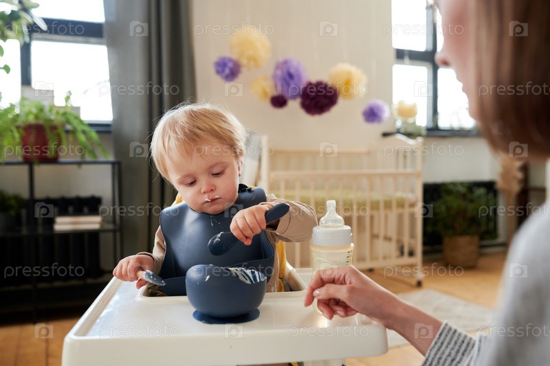 Маленький ребенок учится есть ложкой