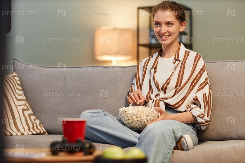 Улыбающаяся женщина смотрит телевизор дома и ест попкорн