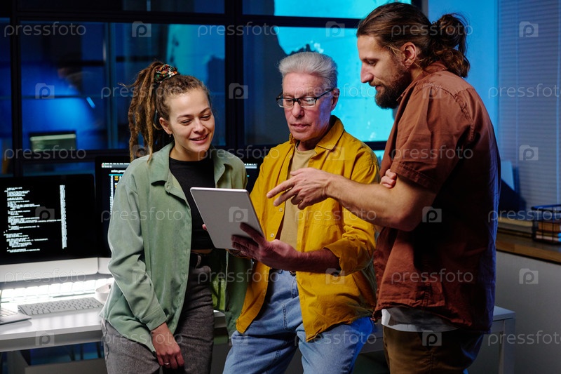 Молодой уверенный в себе мужчина, указывающий на экран планшета во время презентации