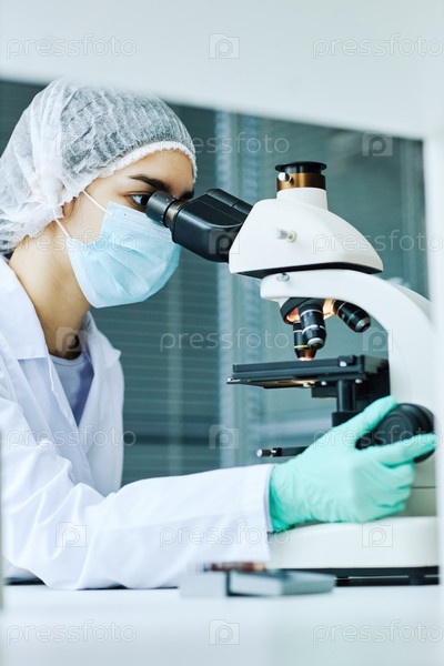 Женщина-учёный, глядящая в микроскоп, работающая в лаборатории, синие тона
