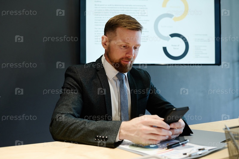 Бизнесмен, использующий мобильный телефон на встрече