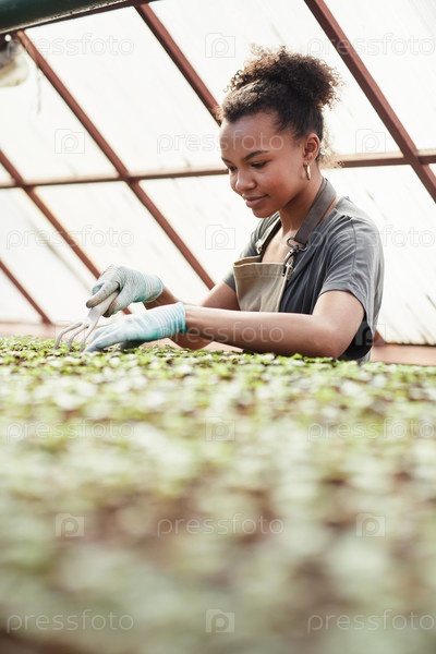 Молодая агрономка расслабляет почву, заботясь о саженцах