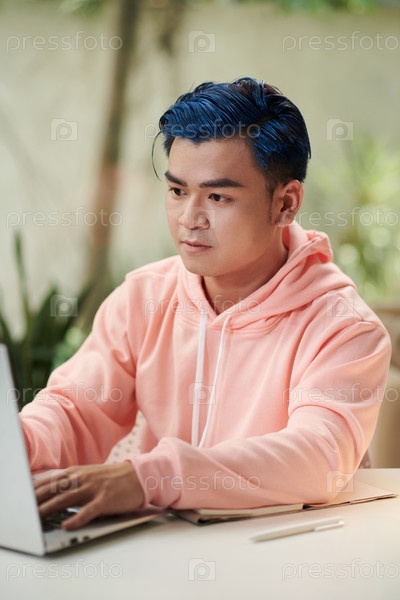 Молодой человек читает краткое содержание на ноутбуке