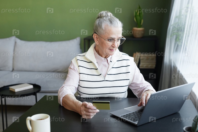 Современная старшая женщина в повседневной одежде смотрит на экран ноутбука