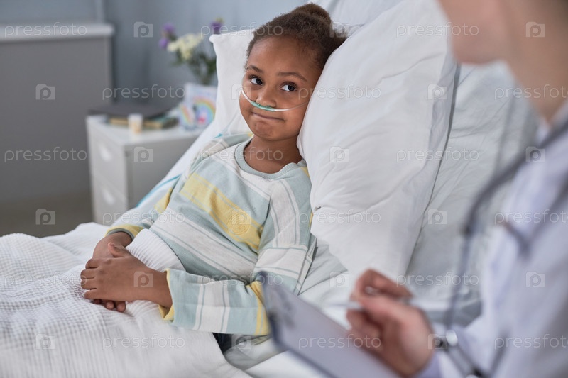 Портрет маленькой чернокожей девочки, лежащей в постели в больничной комнате