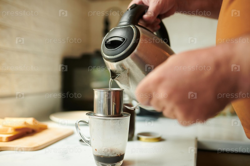 Человек наливает горячую воду в фильтр Phin Man