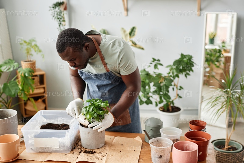 Африканский американец пересаживает растения в помещении, тщательно подбирая почвенную смесь